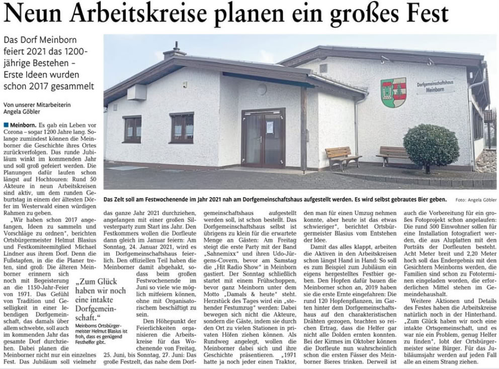Große Ereignisse werfen ihre Schatten voraus. So auch das Jubiläum von Meinborn. Meinborn, der älteste Ort im Niederwesterwald, wurde im Jahr 821 das erste Mal urkundlich erwähnt. Im Jahr 2021 werden wir das 1200-jährige Jubiläum ausgiebig feiern und sind daher schon frühzeitig in die Planung der Feierlichkeiten eingestiegen. Die Gemeinde hat am 24. Februar 2017 alle interessierten Bürgerinnen und Bürger eingeladen und dazu aufgerufen, Ideen und Vorschläge für die Gestaltung des Jubiläums einzureichen. Hierbei hatte jeder die Möglichkeit, seine Bereitschaft zur Mitarbeit in einem Festkomitee zu erklären. Unter allen Interessierten wurde am 21. April 2017 ein Festkomitee gewählt. Ihm gehören sieben Mitglieder an.