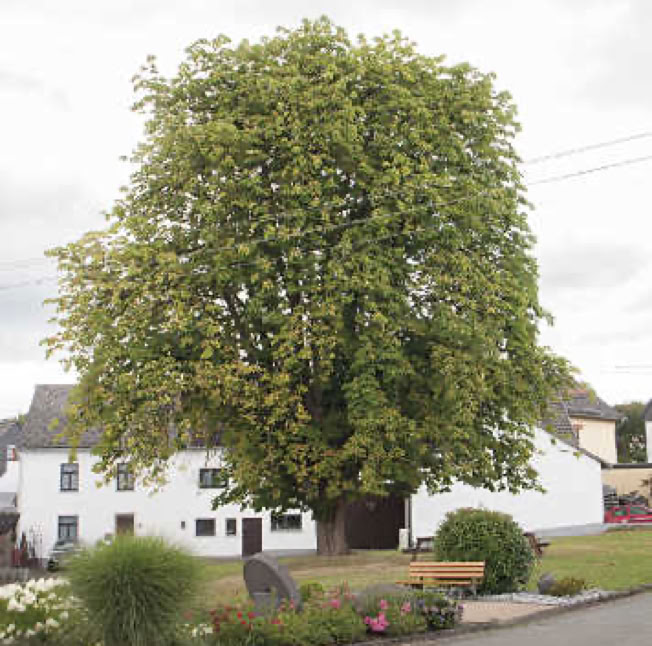 Das grüne Farbfeld steht für die wald- und wiesenreiche Umgebung, in welcher die 1984 unter Naturdenkmalschutz gestellte Rosskastanie abgebildet ist.