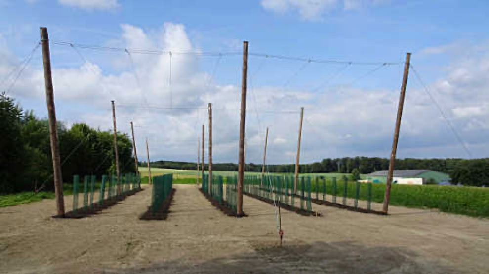 Der Arbeitskreis Hopfen, bestehend aus neun Mitgliedern möchte allen Interessierten schon vor dem Jubiläum zeigen wie Hopfen angebaut wird. Der frühe Beginn ist notwendig, damit im Jubiläumsjahr ein richtiger Ertrag möglich wird. Alle Beteiligten sind zunächst ohne Fachwissen an dieses Unternehmen herangegangen. Seit Oktober letztes Jahres beschäftigen wir uns deshalb intensiv mit Fragen der Bodenbeschaffenheit, des Gerüstaufbaus, der Hopfensortenauswahl und des Pflanzenschutzes. Durch Unterstützung eines hiesigen Landwirtes, eines Hopfenbauers aus der Eifel und mit der fachlichen Beratung für den Anlagenbau aus Pfaffenhofen (Hallertau) sind wir zu dem heutigen Ergebnis gekommen. Die Anlage umfasst eine Größe von 36m x 12m, hat eine Höhe von 7m und wurde mit 150 Hopfenpflanzen der Sorte „Spalter-Select“ bestückt.